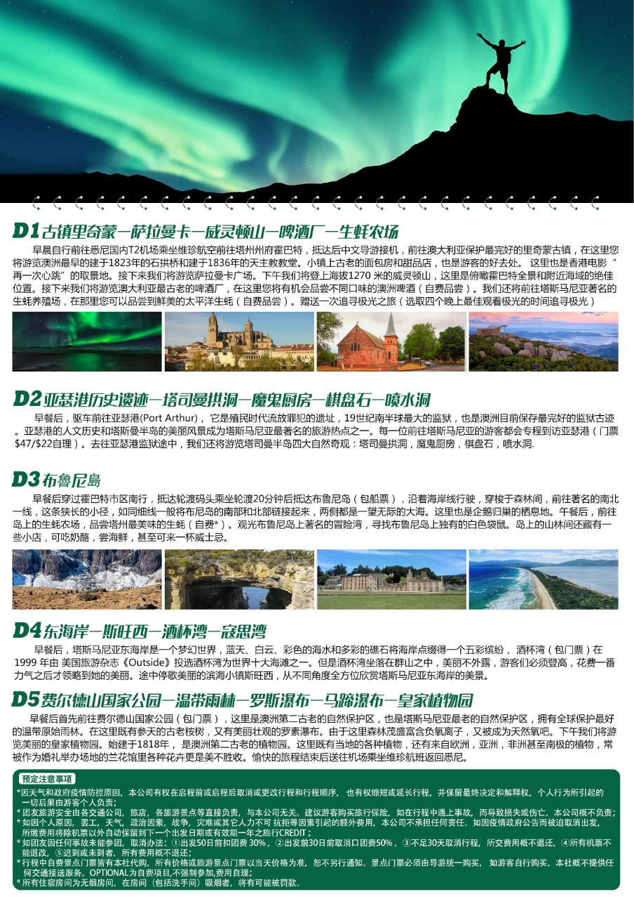 早晨自行前往(请务必提前1.5小时抵达)墨尔本T4国内机场乘坐捷星JQ719航班,6:45前往塔州州府霍巴特,8:35抵达后,中文导游在机场接机。前往费尔德山国家公园(包门票),这里是澳洲第二古老的自然保护区,也是塔斯马尼亚最老的自然保护区,拥有全球保护最好的温带原始雨林。在这里既有参天的古老桉树,又有美丽壮观的罗素瀑布。由于这里森林茂盛富含负氧离子,又被成为天然氧吧。下午我们将游览美丽的皇家植物园。始建于1818年, 是澳洲第二古老的植物园。这里既有当地的各种植物,还有来自欧洲,亚洲,非洲甚至南极的植物,常被作为婚礼举办场地的兰花馆里各种花卉更是美不胜收。赠送一次追寻极光之旅(选取四个晚上最佳观看极光的时间追寻极光,*如果指数不到 5,看不到极光的情况下导游有权利取消晚上外出)。入住霍巴特市区4星酒店。